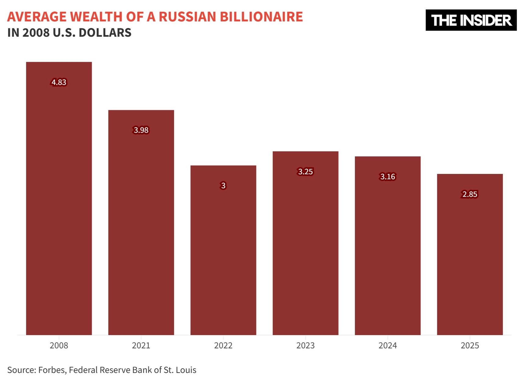 Still, the net worth of a typical Russian billionaire has fallen. In 2008 dollars, the average wealth of a Russian on the list was $4.83 billion, and in 2021 it was still $3.98 billion, but by 2025 it had dropped to just $2.85 billion. Today, the real assets of the average Russian billionaire amount to 72% of what they held before the war and 59% of the 2008 level.