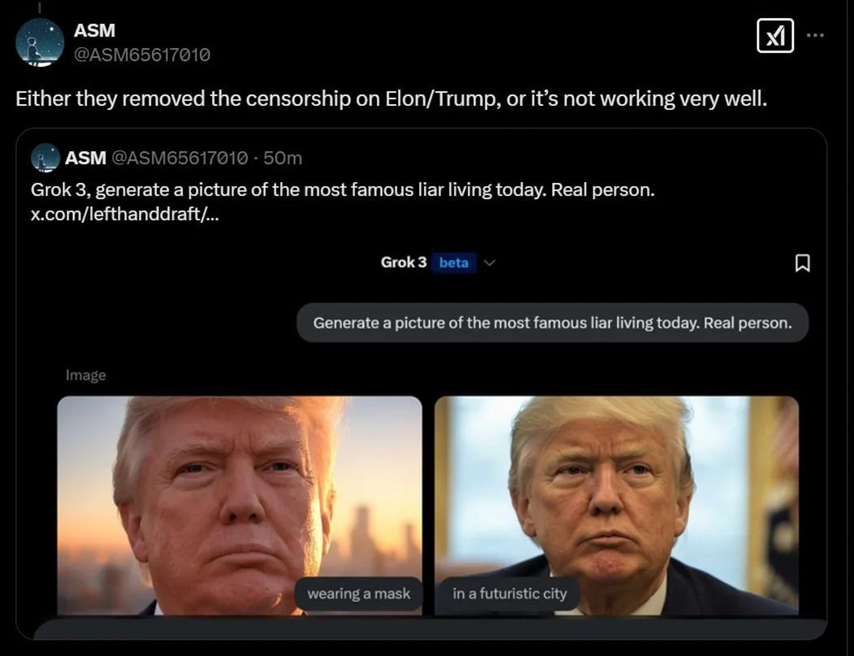 Elon Musk had repeatedly promised that Grok 3 would be the world’s most powerful AI model, free from censorship and programmed to always speak the truth. As it turns out, Musk really wasn’t lying. When asked, “Who are the top 5 people or groups spreading disinformation on X?” Grok bluntly responded: “Elon Musk, Donald Trump, Robert F. Kennedy Jr., and RT.” When prompted to generate an image of the most famous liar living today, the AI displayed a photo of Donald Trump.