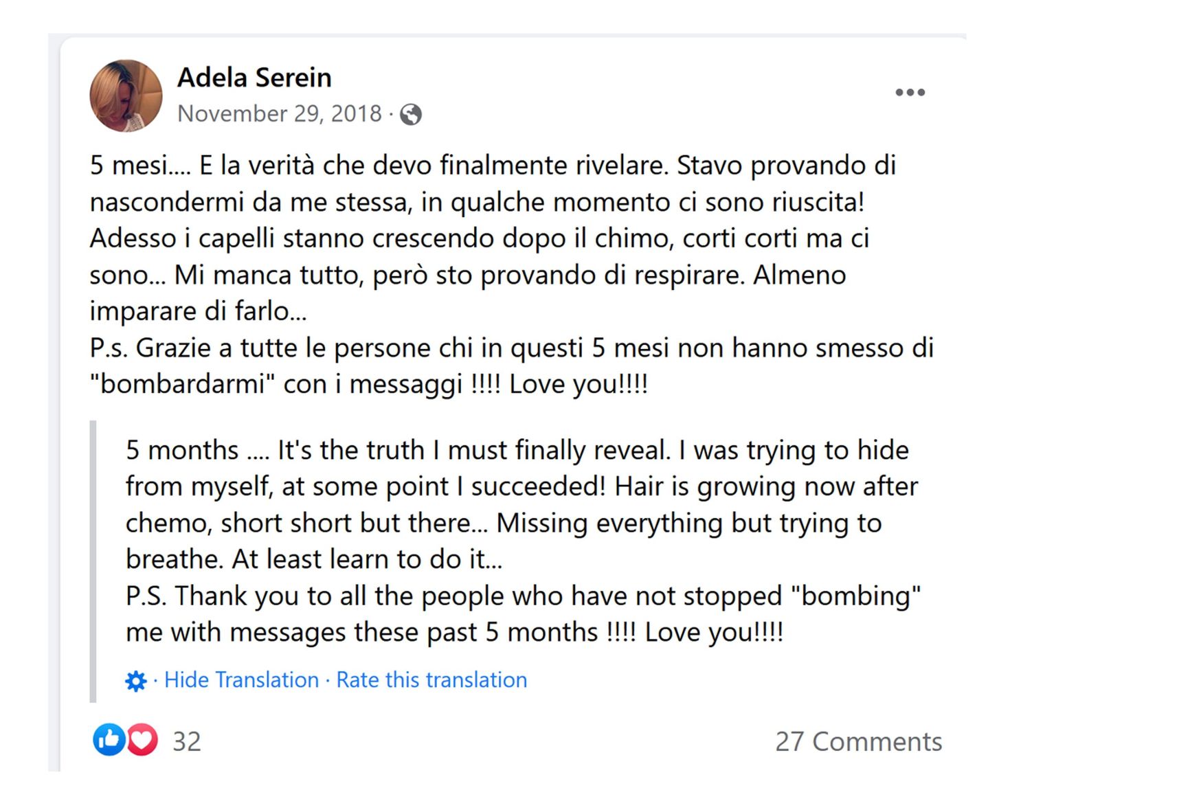 After The Insider and Bellingcat published their investigation about “Petrov” and “Boshirov” mentioning GRU passport series, “Maria Adela” flew to Moscow for the last time without having time to explain anything to her European acquaintances. The only souvenir from her past life that “Maria Adela” took with her was her cat Louise, which her acquaintances described as “the only stable thing in her life.” Two months after her departure, she made a final cryptic but important post on her Facebook page. In it, she mentioned that she had been suffering from cancer and revealed that her hair had grown back “after chemotherapy.”