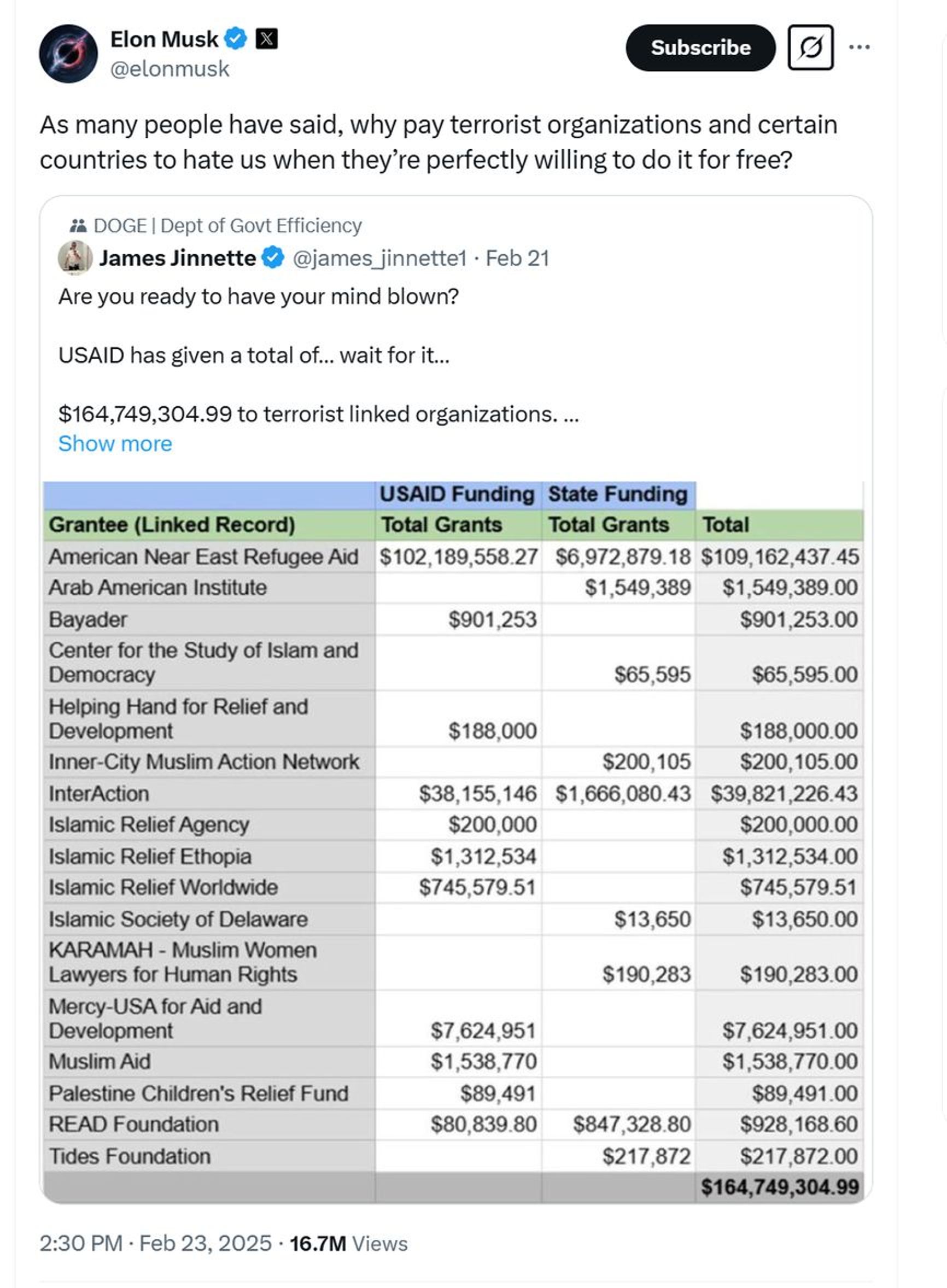 Musk has also been spreading a screenshot of a supposed financial table, which he claims shows that USAID transferred more than $164 million to “organizations linked to terrorists.” His social media post accompanying the photograph asked rhetorically: “As many people have said, why pay terrorist organizations and certain countries to hate us when they’re perfectly willing to do it for free?”