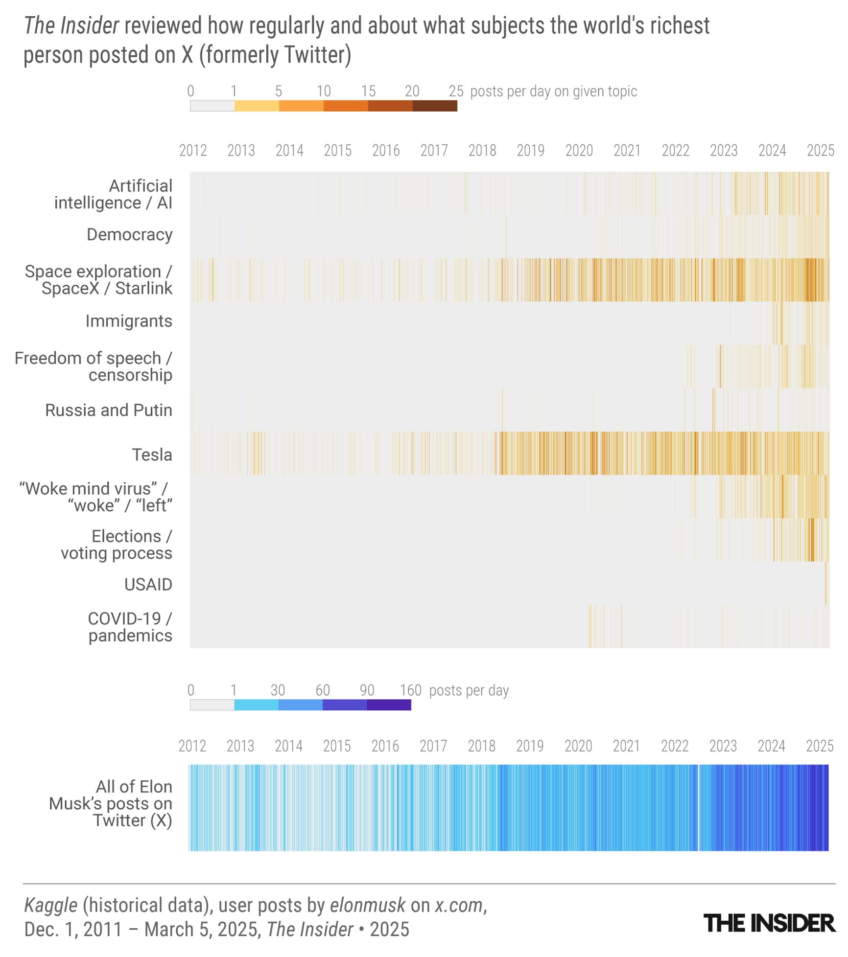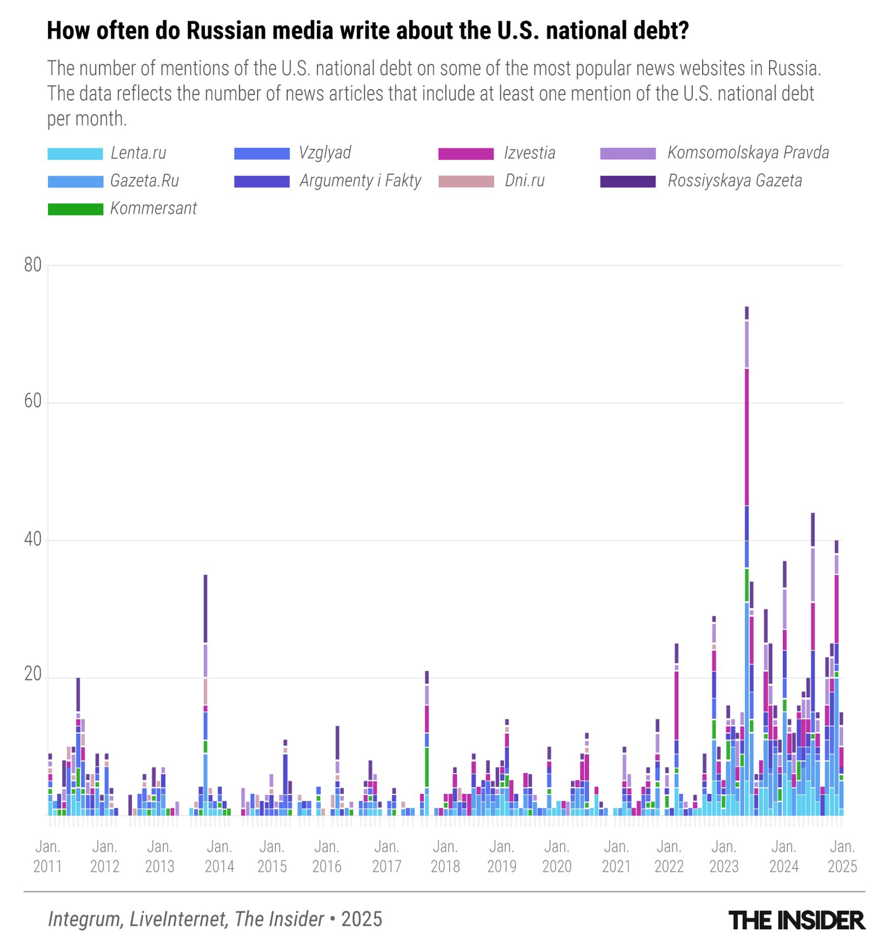 As The Insider has reported, Russian media’s fearmongering over the U.S. national debt became far more prevalent after the invasion of Ukraine. Musk himself, however, had not publicly addressed the issue — or many others — until late 2024. Now, a substantial portion of his posts on X are dedicated to the national debt. Since the start of 2025, he has written about it at least 140 times — more than he did in the entire previous year (and before that, the topic had never featured in his social media output.)