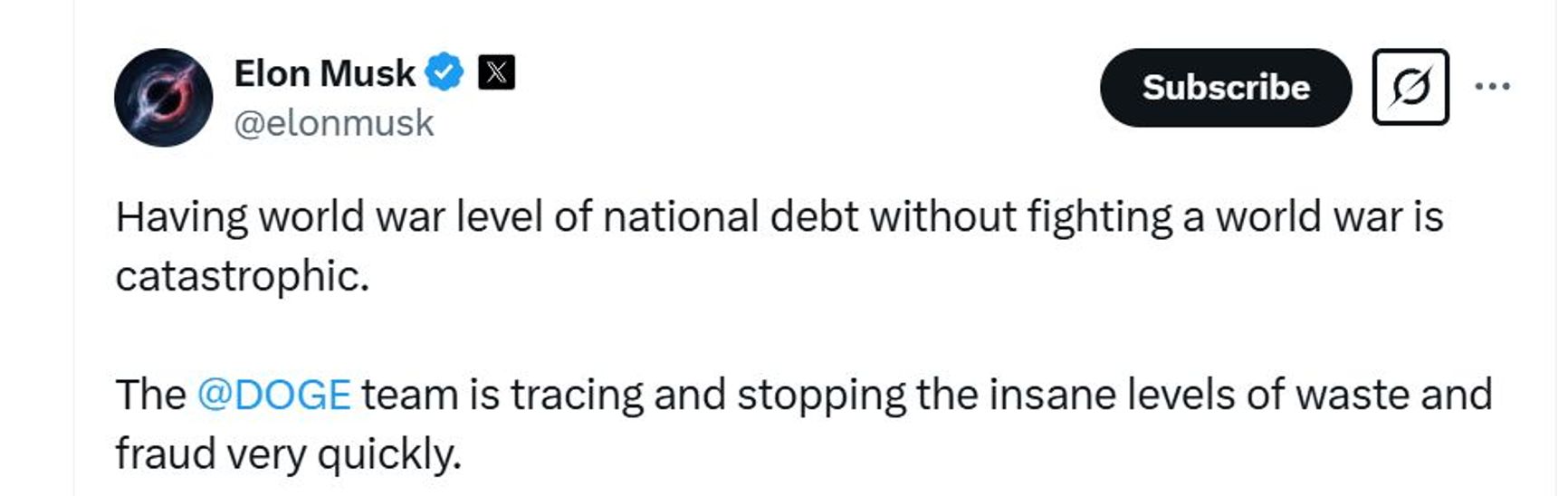 Musk has written that “having [a] world war level of national debt without fighting a world war is catastrophic [for the country]” and has vowed that the DOGE team will fight against what he calls “insane levels of waste and fraud.”