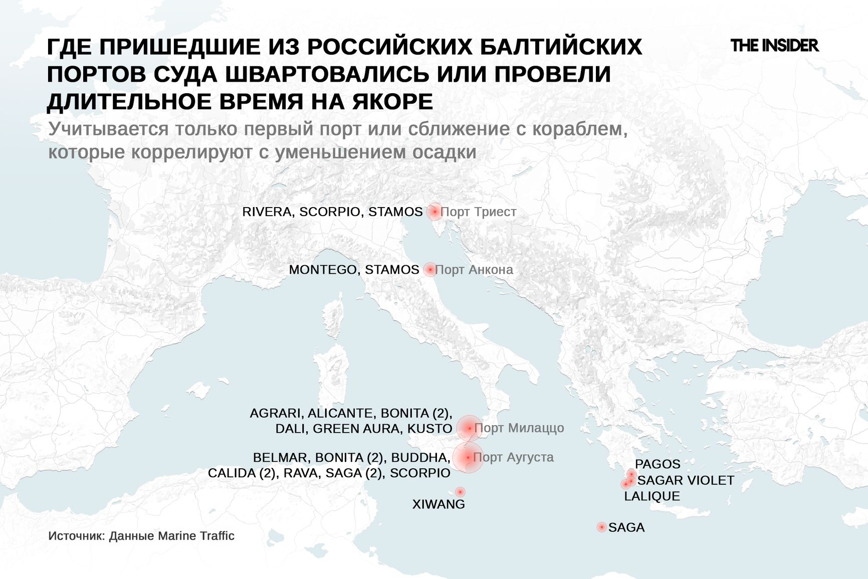 Когда танкер разгружается, его осадка уменьшается, и данные об изменении осадки (не всегда полные и не всегда корректные) видны в системе Marine Traffic. Согласно этой системе, в прошлом году в портах Средиземного моря или рядом с ними побывали и/или уменьшили свою осадку как минимум 20 танкеров, пришедших из российских нефтяных портов на Балтийском море, подсчитал The Insider. Помимо порта Аугуста, это другой сицилийский порт — Милаццо, а также порт в Триесте и акватория близ Мальты. Многие корабли, побывав у берегов Италии, шли далее в Лаконский залив, а иногда — еще и в Турцию и/или Александрию. Не во всех случаях по базе видно уменьшение осадки этих танкеров, но сам факт приближения к итальянским портам позволяет предполагать, что танкеры выгружали там нефть, иначе судам нет смысла швартоваться, менять курс и стоять на рейде, тратя время и деньги.