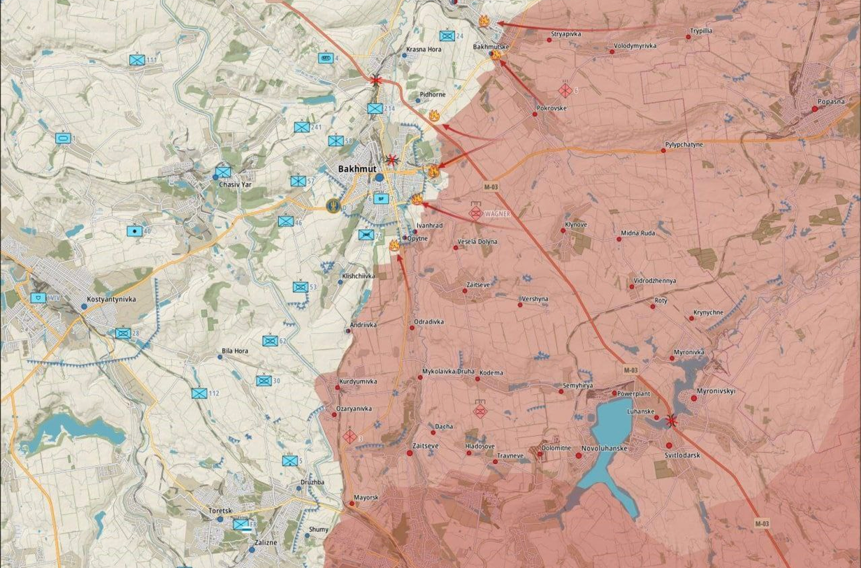 Бахмутское направление остаётся самой горячей точкой на фронте. Пророссийский Telegram-канал «Рыбарь» пишет, что штурмовые отряды ЧВК Вагнера прорвали оборону ВСУ на восточной окраине Бахмута. По этим данным, на Бахмутском (Артемовском) участке российские подразделения установили полный контроль над Заводом шампанских вин и заводом «Синиат». К юго-востоку идут бои возле мусоросортировочного завода и на улице Фёдора Максименко. «Рыбарь» заявляет, что штурмовые группы также продвигаются к северо-востоку. В районе села Подгородное были заняты несколько опорных пунктов ВСУ.