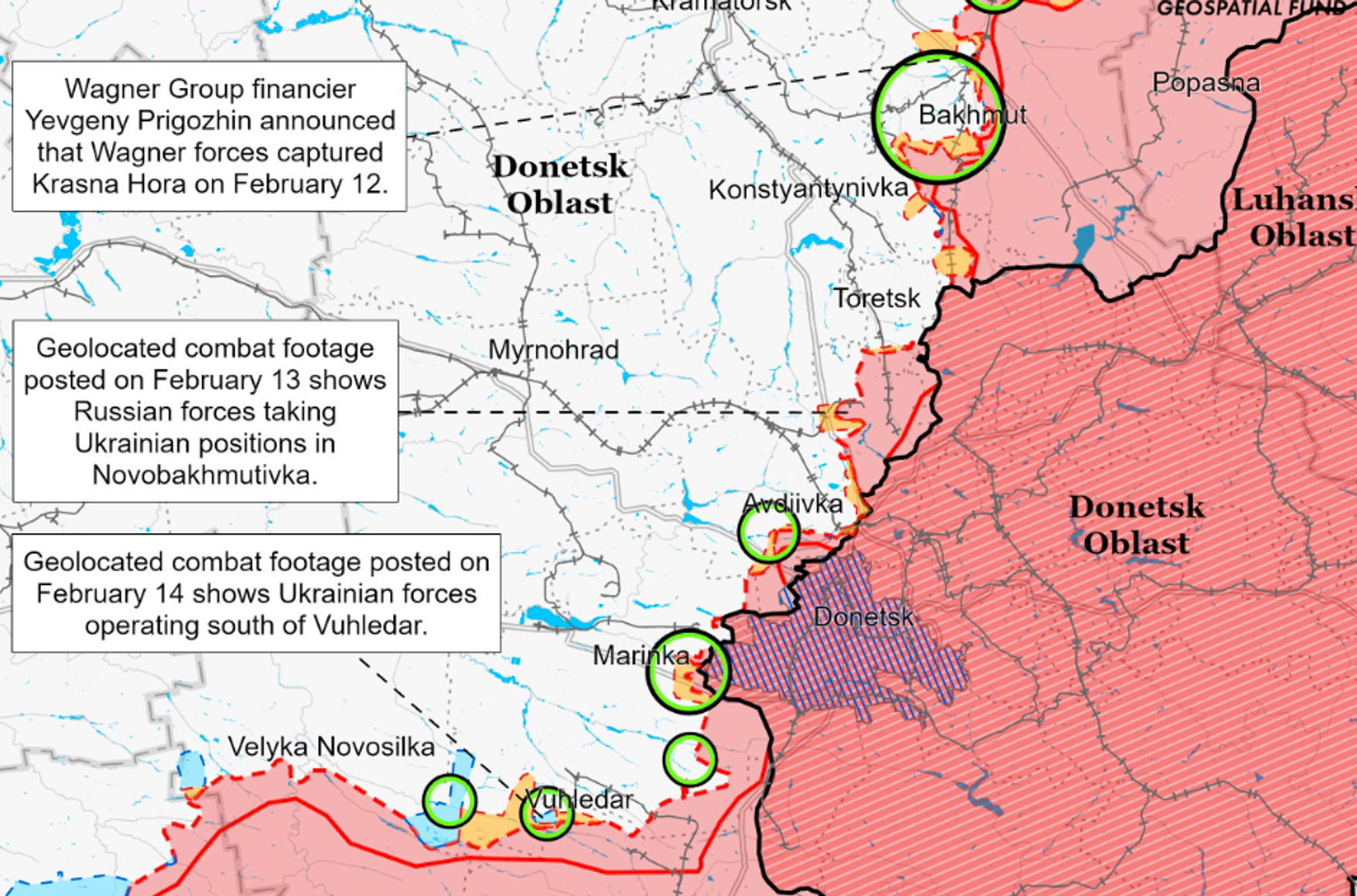 Военкор-пропагандист ВГТРК Евгений Поддубный в своем Telegram-канале утверждает, что Красная Гора, несмотря на противоречивые данные, взята войсками РФ, а в Парасковиевке продолжаются ожесточенные бои. Также его канал опубликовал видео с телами из пригорода Бахмута (пропагандисты называют город Артемовск). На кадрах показаны трупы солдат, а также «выкошенные» артиллерийским огнем деревья.