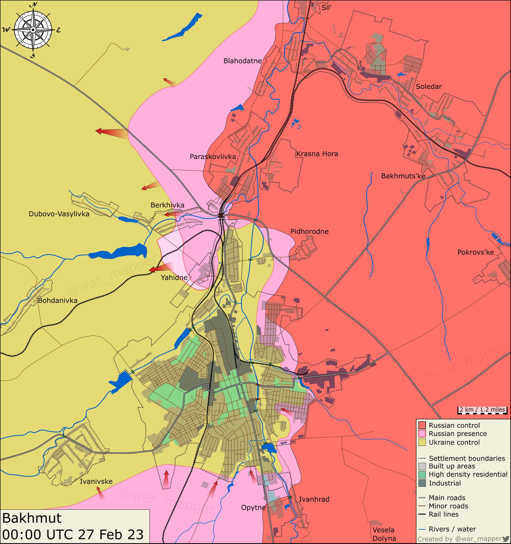 Военный эксперт Роман Свитан заявил в разговоре с The Insider, что часть реки Бахмутка встроена в общий рубеж обороны, который завязан на высотах в районе Часова Яра. Там расположена артиллерия, которая не дает российской группировке зайти в город и прикрывает куполом гарнизон ВСУ в Бахмуте.