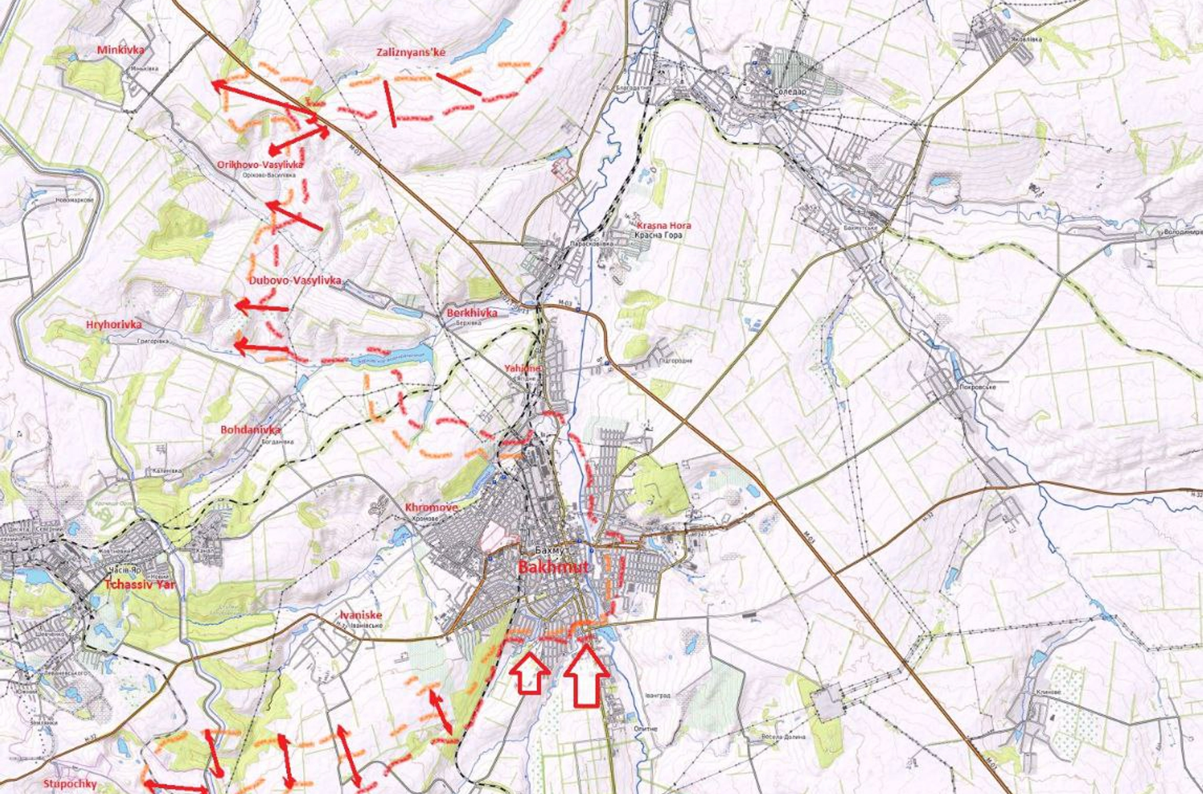В последние несколько дней, чтобы уменьшить давление противника на автотрассу H-32 (Покров — Бахмут — Михайловка), по которой проходит линия снабжения, бойцы ВСУ начали локальную контратаку к западу от Бахмута. Ранее Генштаб ВСУ сообщал, что наступление российских сил на Лиманском, Бахмутском, Авдеевском, Марьинском и Шахтерском направлениях продолжается.