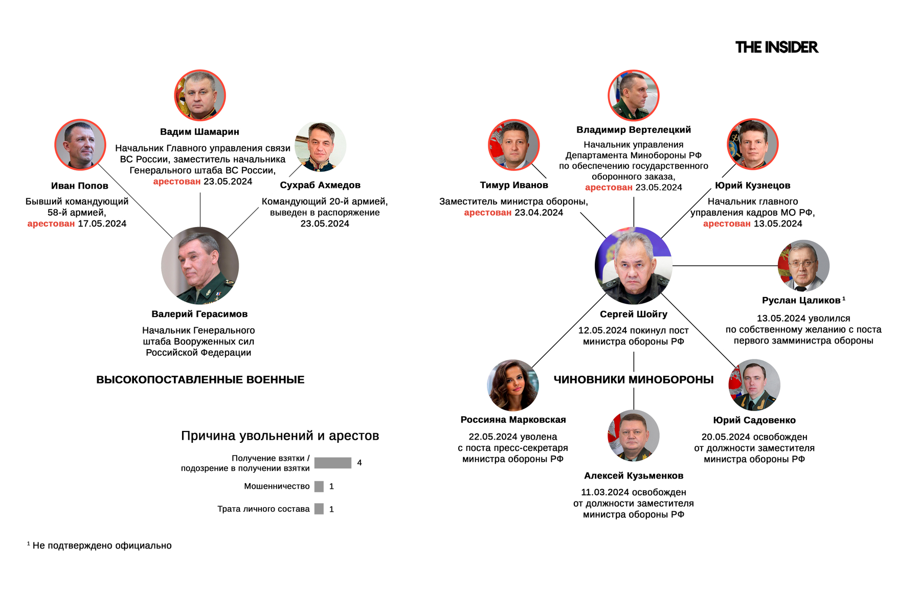 • 20 мая — освобожден от должности заместитель министра МО, генерал-полковник Юрий Садовенко — больше 11 лет руководил аппаратом министра обороны Российской Федерации. Был ближайшим соратником Сергея Шойгу — работал под его руководством с 2002 по 2024 год. Переведен на должность аудитора Счетной палаты.