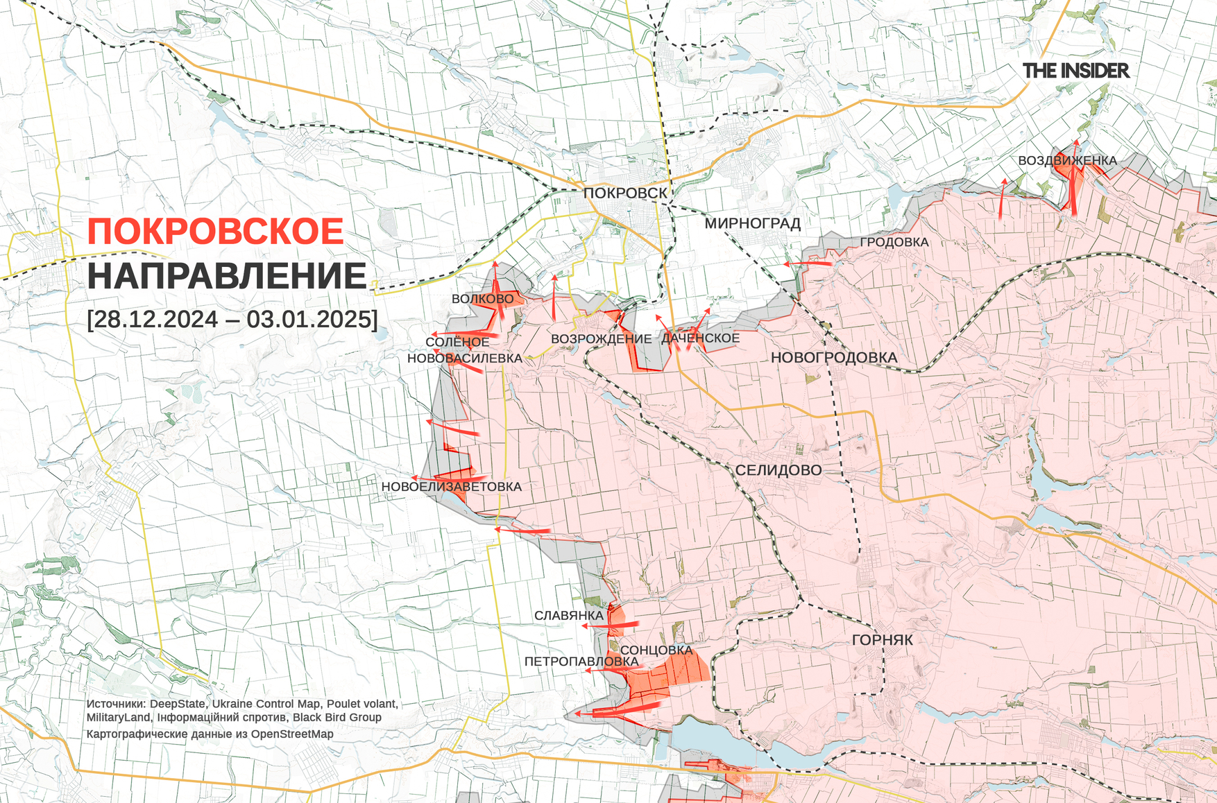 Наконец, 3 января DeepState сообщил о захвате населенных пунктов Даченское, Возрождение (до сентября 2024 года — Новый Труд) и Волково, а также о продвижении противника в Зелёном, Воздвиженке и Нововасилевке на покровском направлении и Янтарном и Сонцовке (до 2016 года — Красное) в Кураховском операционном районе.
